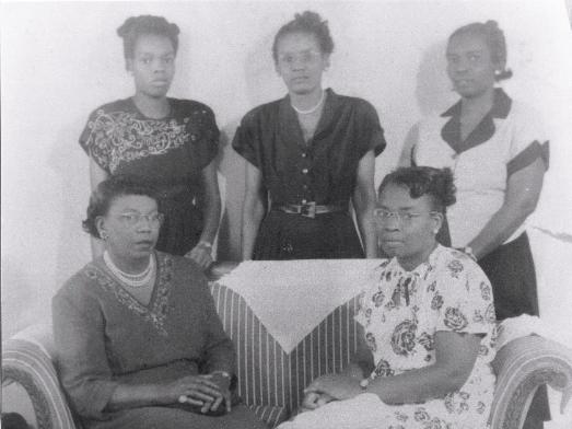 Daughters of Thomas and Maggie Sims, back from left: Maggie, Rosa Lee, Rowena. Front sitting from left: Ruth, Wilma, abt. 1953